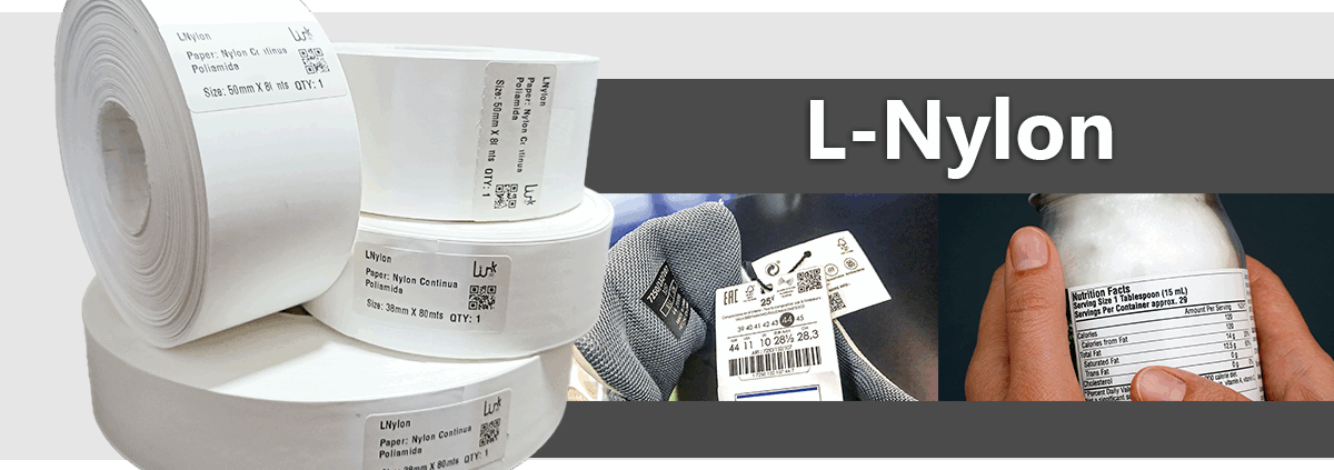 Los beneficios más destacados de la poliamida L-Nylon son su durabilidad, que asegura la permanencia de la información incluso tras múltiples lavados o procesos de desgaste, y su versatilidad, al ser compatibles con códigos de barras, datos de trazabilidad, instrucciones de cuidado de prendas, advertencias de seguridad y más.